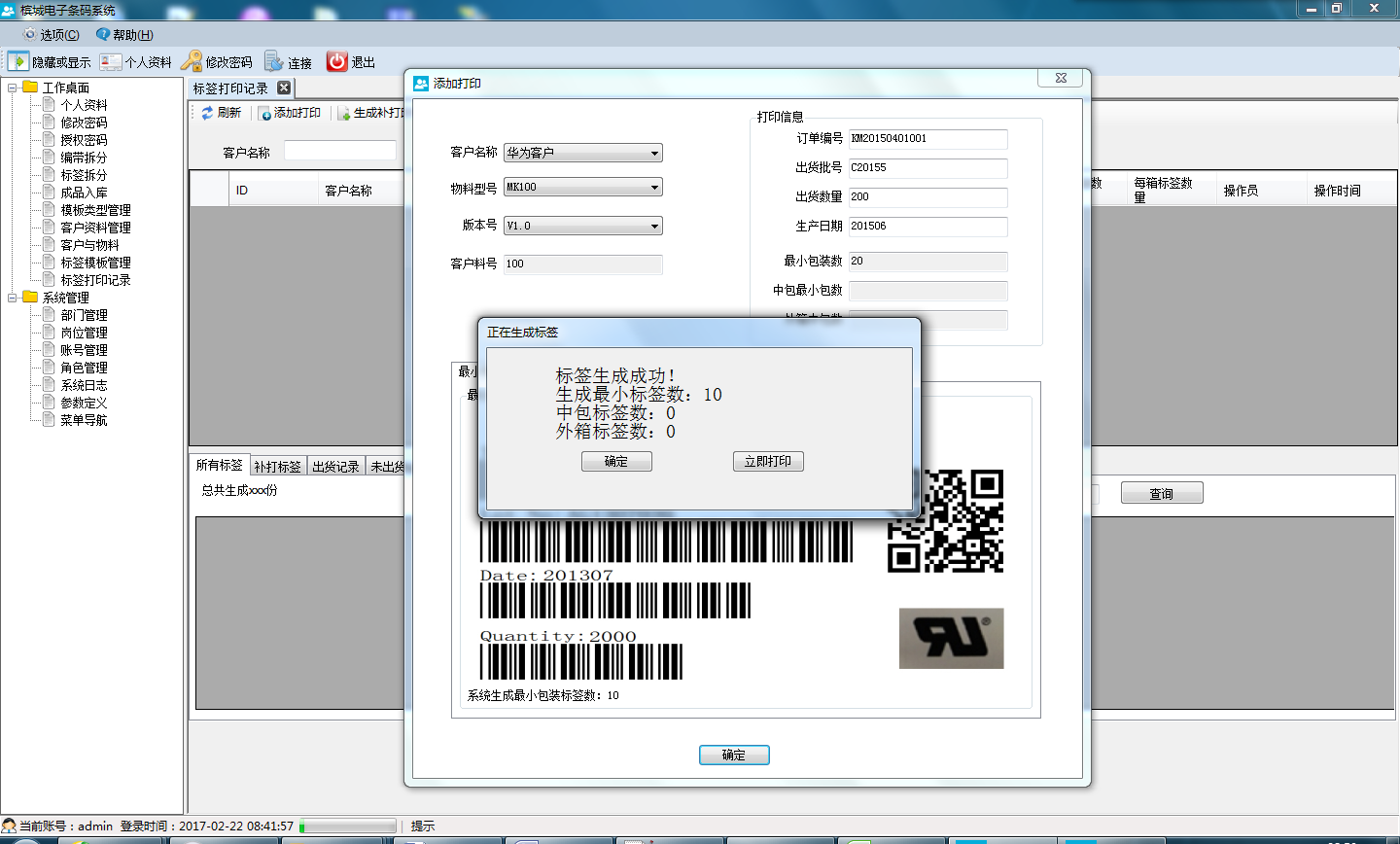 1)、根據(jù)規(guī)則錄入訂單號,產(chǎn)品型號,數(shù)量自動生成規(guī)定數(shù)量的標(biāo)簽;