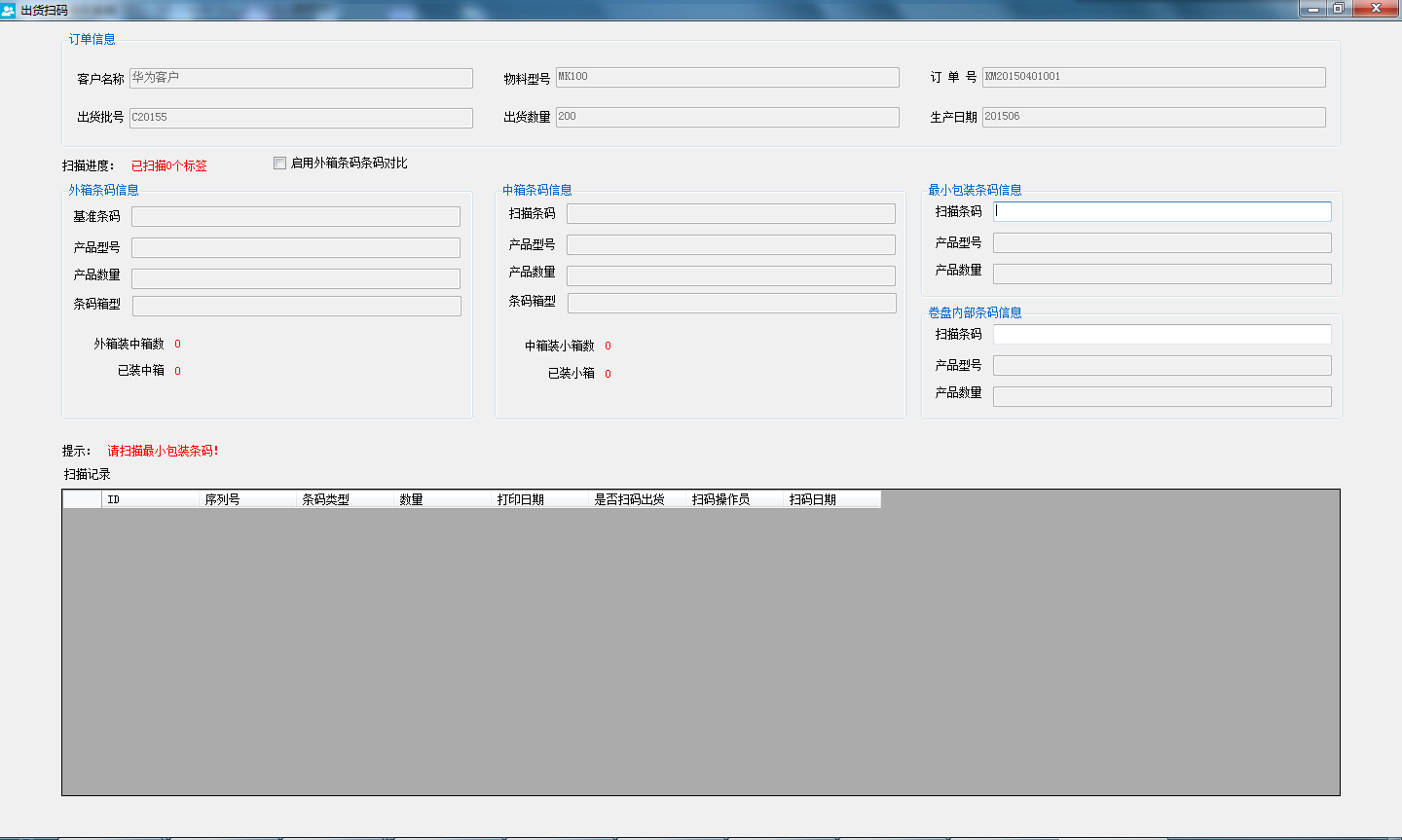 1)、掃描內(nèi)部編帶二維碼與出貨標(biāo)簽二維碼,對兩個二維碼型號進(jìn)行比對;